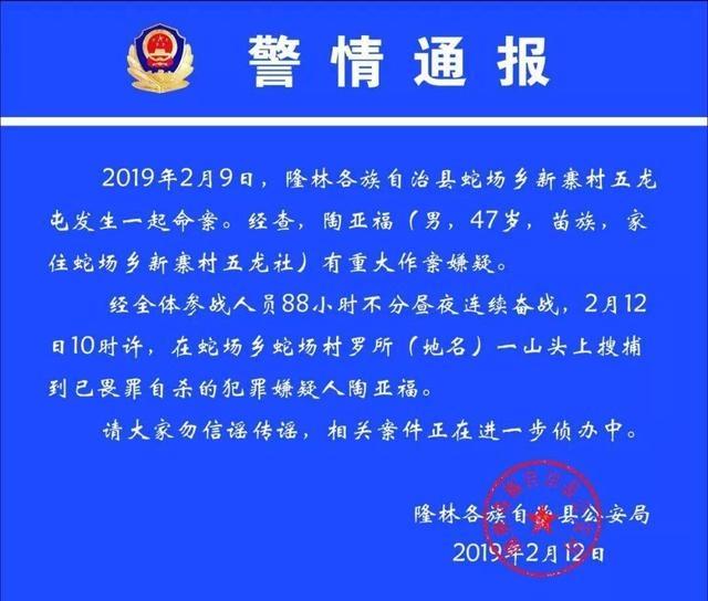 2月9日(大年初五),百色市隆林各族自治县蛇场乡发生一起命案,一男一女两人被害身亡。 当地公安局介入调查后,迅速锁定了案件犯罪嫌疑人陶亚福(男,47岁)。 因嫌犯作案后逃脱,警方在展开大范围搜捕的同时,发布了通告悬赏1万元向群众征集线索。 2月12日,记者从隆林各族自治县公安局获悉,经过参战人员80多个小时的搜捕,警方当天上午在蛇场乡一处山头搜捕到已畏罪自杀的犯罪嫌疑人陶亚福。当天,警方发布了相关警情通报。 来源丨南国早报客户端记者 蒋文跃 【郑重声明】本文版权归原作者所有,转载文章仅为传播更多信息之目的,如作者信息标记有误或涉及侵权,请第一时间联系我们修改或删除,谢谢! |